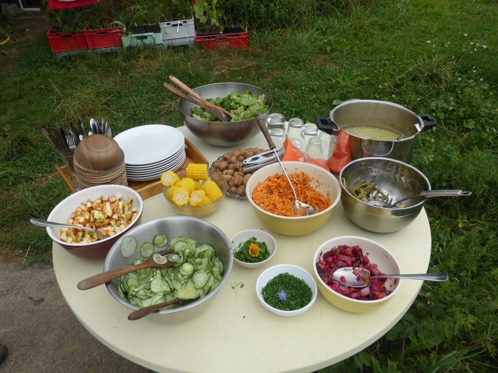 Wir verwöhnen euch mit einem bunten Buffet! Aus unserem frischen Gemüse zaubern wir verschiedene Salate und Kartoffelgratin, dazu gibt es hausgemachtes Tempeh und zum Dessert Früchtekompott mit Granola. Ein Zitronenmelisse Aufguss und selbst gemachter Apfelsaft runden das Vergnügen ab.